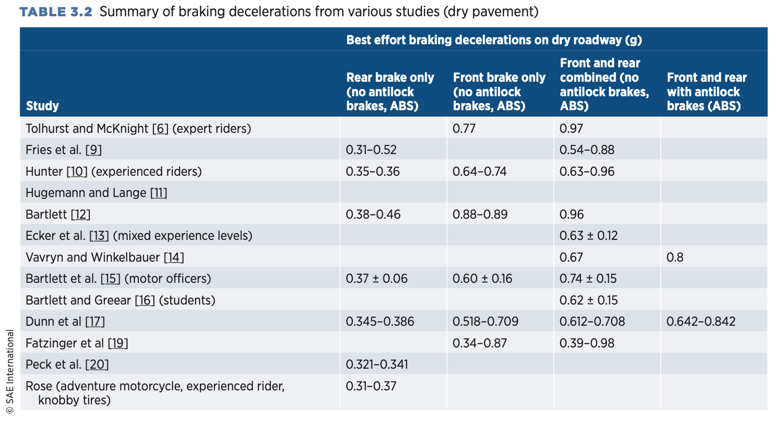 Similarly, many passenger car drivers also hold back and do not fully utilize the braking capabilities of their vehicles. That said, there is no danger of instability in fully applying the brakes of a passenger vehicle. If a passenger car driver chooses to fully apply the brakes of their vehicle, they are likely to succeed at producing a high level of deceleration, at or near the full capability of the vehicle. Motorcyclists, on the other hand, are usually not capable of fully utilizing the capabilities of their motorcycle, even if they decided to try. A driver who fully applies the brakes on a modern vehicle with antilock brakes will produce decelerations in the 0.9g to 1.1g range. Average motorcyclists who attempt to maximize their deceleration under heavy braking will likely produce decelerations in the range of 0.5g to 0.8g. Chapter 3 in my book Motorcycle Accident Reconstruction describes the braking capabilities of motorcyclists based on peer-reviewed, technical literature. The following image is Table 3.2 from the book, summarizing the best effort decelerations produced by motorcyclists in twelve technical articles that reported testing with motorcyclists.
